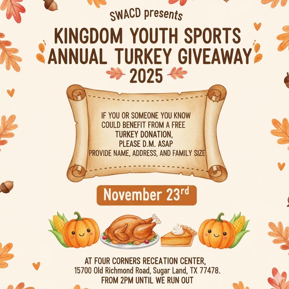 SWACD Inc. has successfully hosted its annual Kingdom Youth Sports Turkey Giveaway for the fourth consecutive year. Building on this tradition of community support, the organization proudly completed the 2025 initiative by giving away close to 100 turkeys to local families.